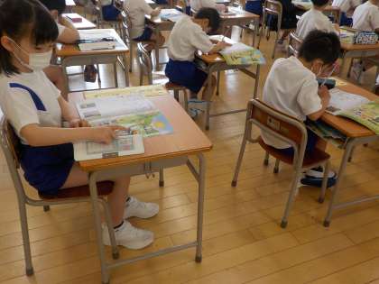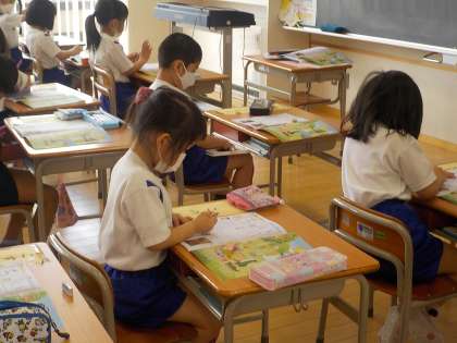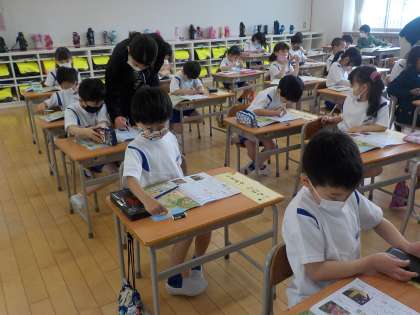 お手本を見て、はね・とめ等に注意しながら、一生懸命にひらがなの練習をしています。
