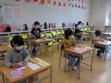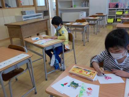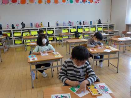 すいか、いちご、うさぎ、ラーメン・・・。 好きな物を思い思いに描いています。