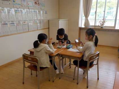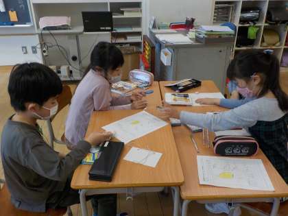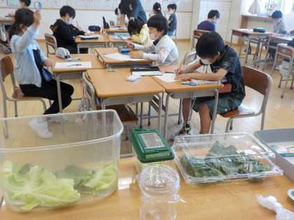 教卓の上には、キャベツをむしゃむしゃ食べる幼虫、虫かごの上の方でじっとしている幼虫、身動きもせず固まっているさなぎ。