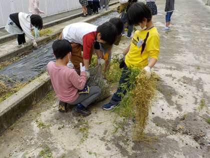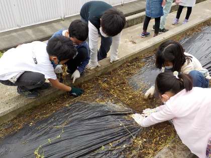 野菜を育てるために、畑の草むしりをしました。畑には、たくさんの雑草が生えていましたが、子供たちは張り切って作業して、あっというまにきれいになりました。
