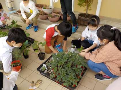 野菜の苗も見比べてみました。子供たちは形や色、手触りの違いなどを見つけていました。このあと植えるのが楽しみですね。