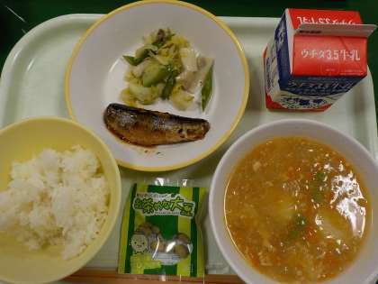 【メニュー】 ・ご飯 ・牛乳 ・いわしの生姜味 ・野菜ソテー ・じゃがいものそぼろ煮 ・抹茶大豆