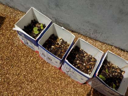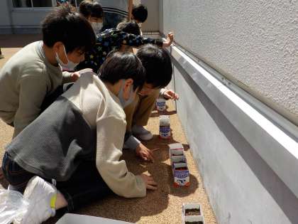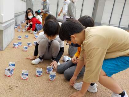 芽が出ることを楽しみにしていた子供たち。うれしそうに、のぞき込んでいます。