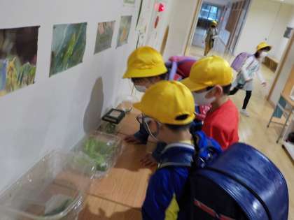 「おお〜!!チョウになっとる。みんな、来て来て」