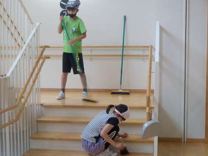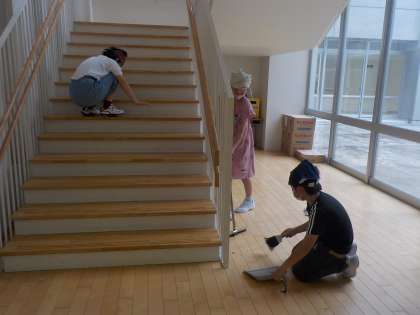 階段は、一段一段丁寧に掃いたり拭いたりします。