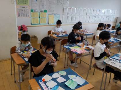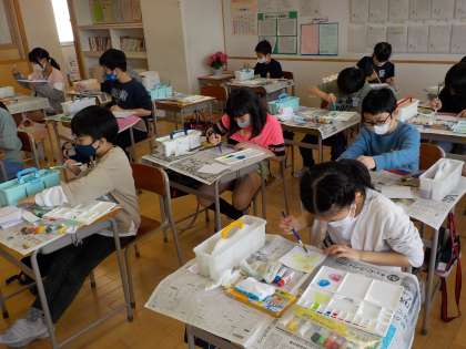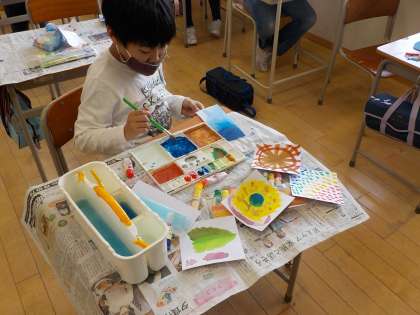 絵の具を使って思いの模様を模様を描き、自分の気持ちや感情を表しました。色の塗り方や濃さどを工夫しながら、様々な感情を表現していました。