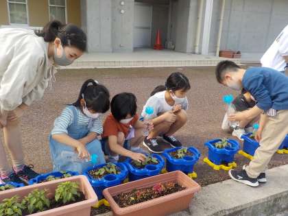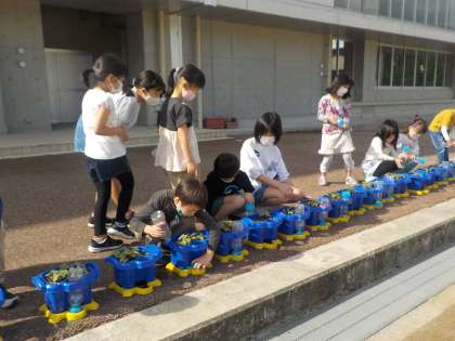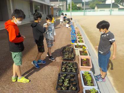 児童玄関前の広場には、アサガオの観察やお世話をする1年生と6年生、ヘチマの様子を見る4年生がやって来ます。