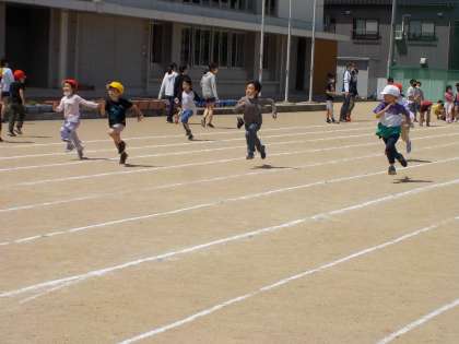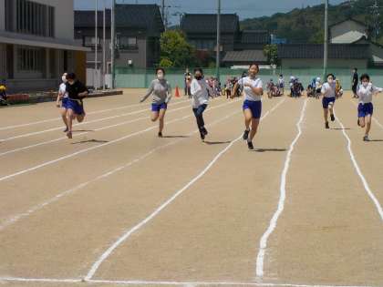 腕をしっかり振り、最後まで力を抜かないように走っています。