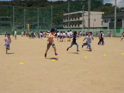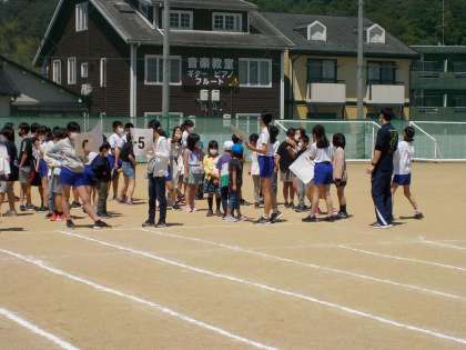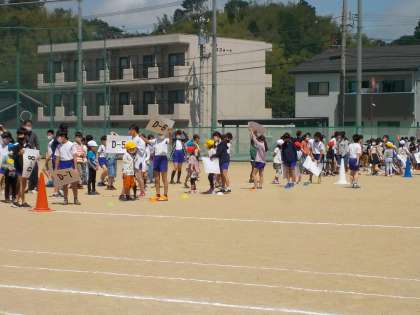 青空の下、異学年のなかよし班ごとに集合し、体力つくり活動の始まりです。