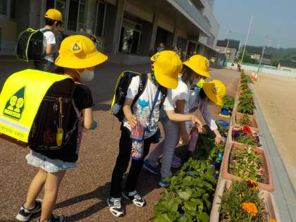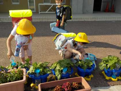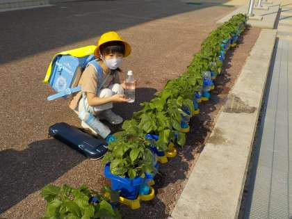1年生は、登校後すぐにアサガオのお世話をしています。