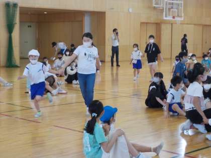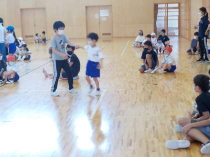 1年生と6年生がペアになり、座りおにごっこをしました。