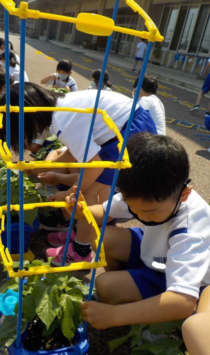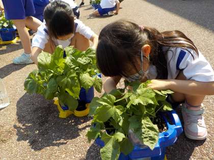 「棒を立てたい。」「もっと大きくなってほしいな。」などの願いから、支柱を立て、肥料をまきました。「手よりも大きくなっている。」とあさがおの生長ぶりに驚いている姿も見られました。