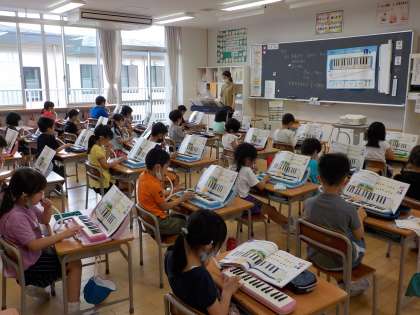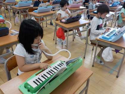 音楽の時間に初めて鍵盤ハーモニカを使いました。大きい音や小さい音、高い音や低い音などいろいろな音を楽しみながら、演奏しました。