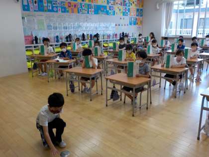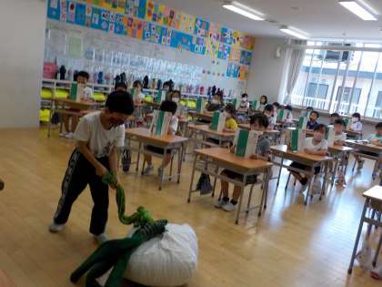 先週から、教室に本物そっくりの大きなかぶが登場しました。「本当に大きい」「おいしそう」と大興奮の子供たち。みんなで音読するときも、役になりきって演技しています。役に分かれて読み合うことも、とても楽しみにしているようです。
