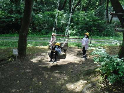 竹でできたアスレチックやブランコで遊びました。最初は怖がっていた子も、慣れてくると笑顔が出てきました。ブランコは友達や先生に押してもらって、楽しんでいました。