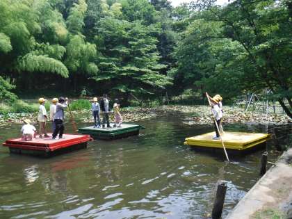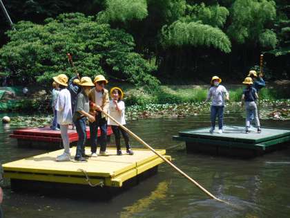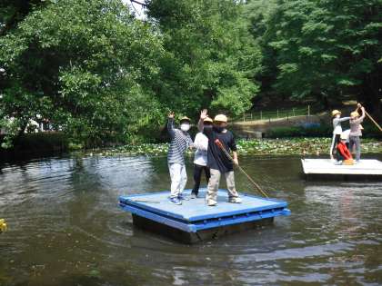 いかだ遊びでは、班のみんなと協力して、いかだを漕ぎました。バランスや漕ぐ向きが難しかったようですが、最後にはコツをつかんでいました。