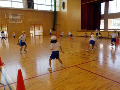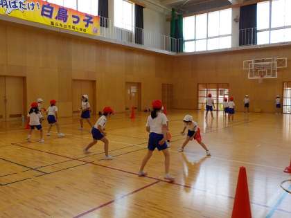 体育科の学習で「たからはこびゲーム」をしています。宝を運ぶチームは、腰に付けたタグを取られないように敵をうまく交わしてゴールに向かいます。たくさんの宝を運べるようにチームごとに作戦を立ててがんばっています。
