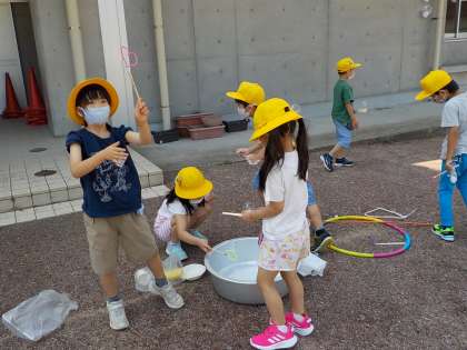 「大きいシャボン玉を作りたい。」「割れないシャボン玉を作りたい。」など思いをもちながら、いろいろなシャボン玉を作りました。「シャボン液が手についてたら、シャボン玉を触っても割れなかったよ。」や「ゆっくりやるとうまくいったよ。」などの気づきがあったようです。