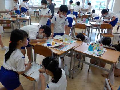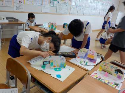 友達の作品をじっと鑑賞し、すてきなところをたくさん見つけていました。