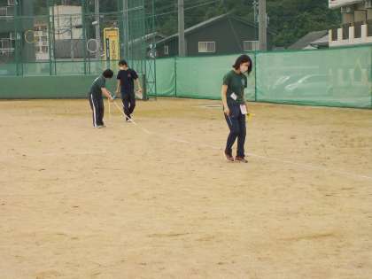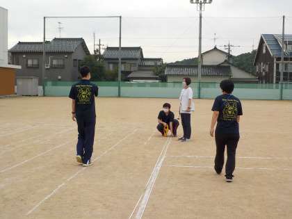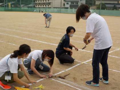 50メートル走やリレーの走路に目印となる杭を打ち付けました。