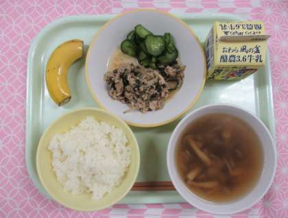 【献立】 ・ごはん ・牛乳 ・豚肉のキムチ炒め ・きゅうりもみ ・茎わかめスープ ・バナナ