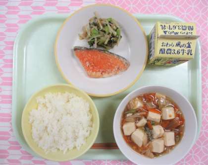 【献立】 ・ごはん ・牛乳 ・鮭のから揚げ ・小松菜ともやしの香味和え ・豆腐の野菜あんかけ
