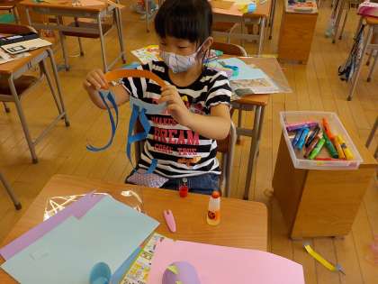 図工で「わっかでへんしん!」の学習をしました。わっかに自分だけのかざりをつけたり、全身コーディネートしたりして、お気に入りのかざりができたようです。みんな楽しく遊べました。