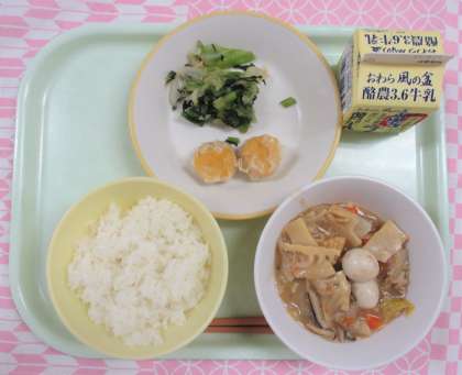 【献立】 ・ごはん ・牛乳 ・八宝菜 ・にんじんシューマイ ・小松菜ひたし