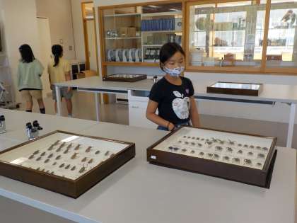 地域にお住まいの「クワガタ博士」のご厚意で、クワガタの標本箱を運んでいただきました。休み時間には、3年生を中心に、白鳥っ子たちが興味深く見ています。