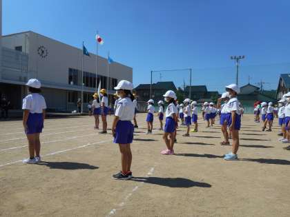 いよいよ来週の運動会本番が近づいてきました。今日は、開会式、ラジオ体操の練習をしました。全校で列を整え、互いの距離を保って、動きを確認しました。晴天のもと、のびのびと体操するのは、とても気持ちよさそうです。