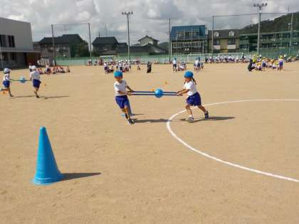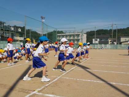 運動会の予行練習を行いました。1枚目は50メートル走、2枚目は玉運びリレーの様子です。