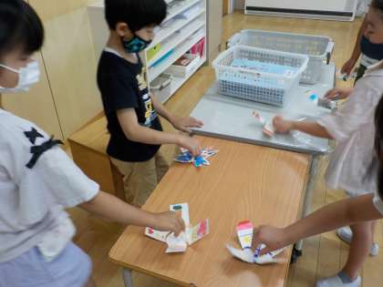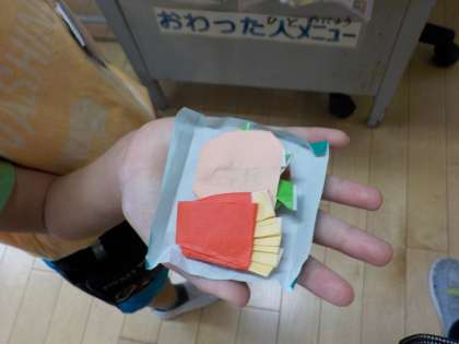 1組では、折り紙でハンバーガーセットを作っている様子を見かけました。本物そっくりの力作にみんなが驚きの声をあげていました。また、牛乳パックで作ったこまを使って、どのこまが長く回るか競争している子たちもいました。思い思いに遊びを楽しむ様子が見られました。