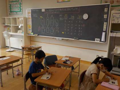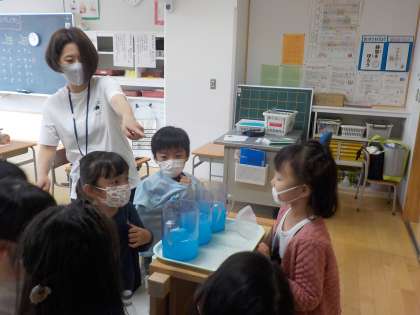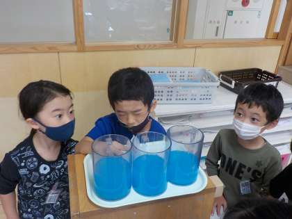 3本のペットボトルに入った色水のかさが一番多いのはどれか予想し、同じ大きさの入れ物に入れ替えて確かめました。予想外の結果に驚く場面もありました。