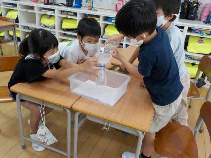 2枚目は、算数の授業で、どちらが多いか比べている様子です。思っていたよりも水が溢れて、驚いてました。