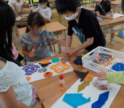 3枚目は、係活動の様子です。もうすぐハロウィンなので、みんなでハロウィンの飾り付けをしています。
