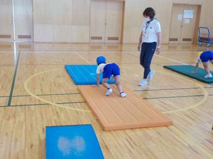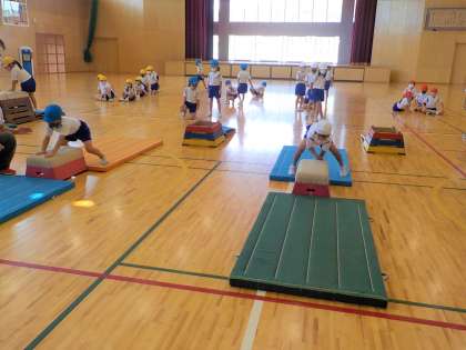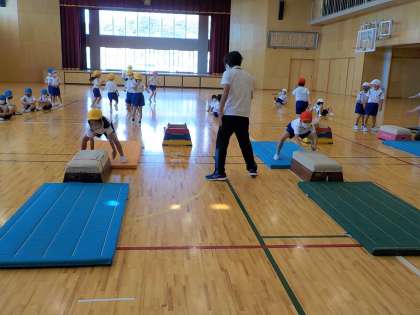 スポーツ指導員の方に跳び箱を教えてもらいました。「初めて跳び箱を跳んだけど、跳べるようになったよ。」「最初は跳べるか不安だったけど、1段ずつだったから怖くなかったよ。もっと上手になりたいな。」など、楽しんで跳び箱を跳ぶことができたようです。