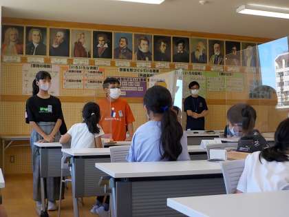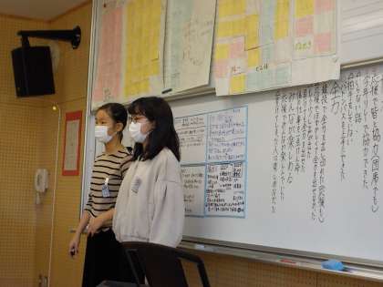 先日行われた運動会について振り返りました。運動会のスローガンが達成できたかについて、各クラスの学級代表が発表しました。また、運動会での経験を、これからの学校生活にどう生かしていくかなどについても考えました。