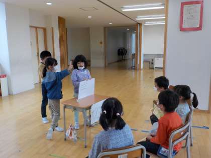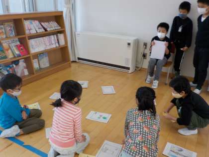 2年生さんに、生活科の学習で育てる野菜のことを教えてもらいました。グループごとにナスやオクラのことをクイズや紙芝居等で紹介してもらいました。「野菜を育てるのが楽しみだな」「とても楽しかったね」という声がたくさん聞かれました。