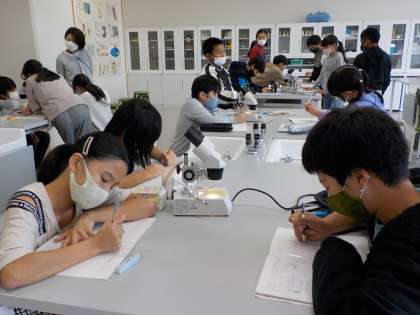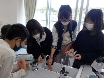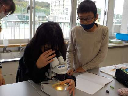 理科では、大地のはたらきについて学習しています。写真は、火山灰の粒を観察している様子です。水で洗って観察することを繰り返すと、だんだんいろいろな粒が見えてくるようになり、みんな夢中でした。観察を通して、火山灰の色や形の特徴を発見していました。