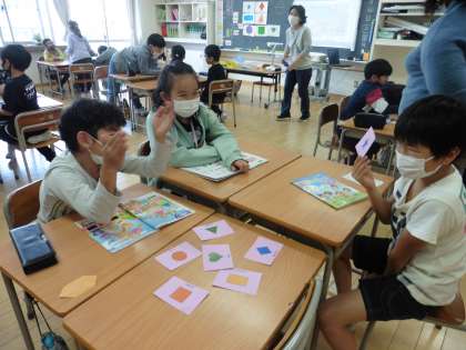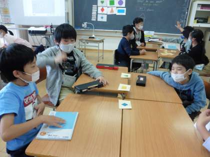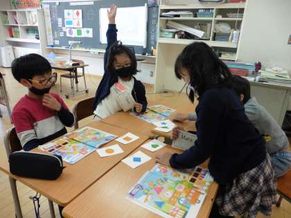 3年生の外国語活動では、形の学習しています。グループでミッシングゲームを楽しみながら、形の言い方に親しんでいます。