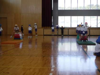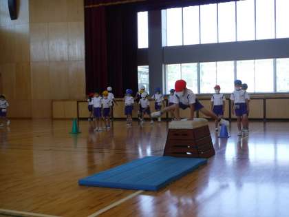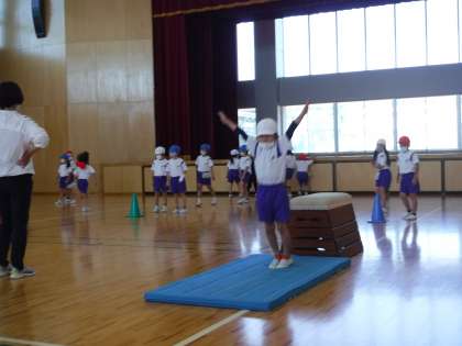 1年生の体育では、跳び箱とマット運動に取り組んできました。今日は、できるようになったことを1人ずつ発表しました。どの子も練習の成果を発揮して、いきいきと発表しました。