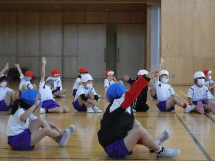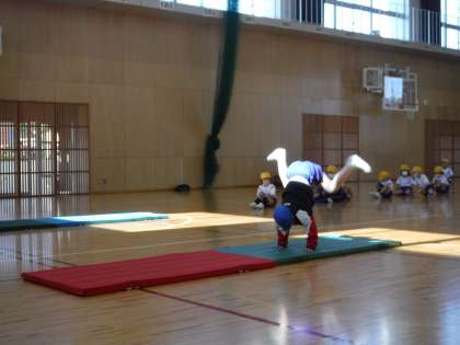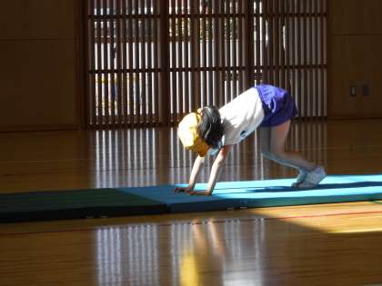 マット運動と振り返りの様子です。