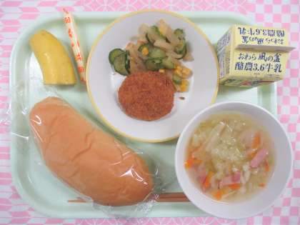〜今日の給食 11月9日(火)〜 公開日 2021/11/09 更新日 2021/11/09 給食室より 【献立】 ・コッペパン ・牛乳 ・豆とかぼちゃのコロッケ ・大根サラダ ・キャベツスープ ・棒チーズ ・バナナ