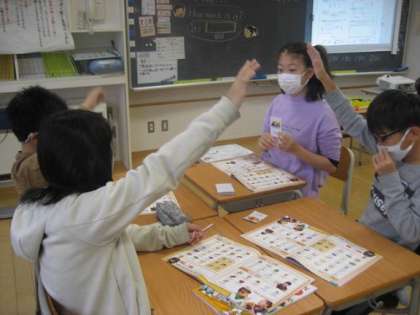 5年生の外国語科では、レストランでのやり取りについて学習しています。この日は、"How much is it?" "It's ○○ yen."の表現を使って、尋ね合いました。