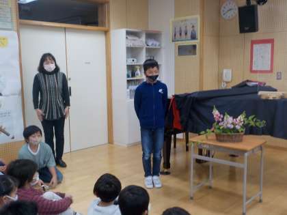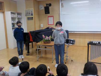 音楽の時間にグループ毎につくりあげたアンサンブル「リボンのおどり」の発表会をしました。職員室の先生方や図書館司書の先生、インターンの大学生を招待し、ミニコンサート形式で開催しました。