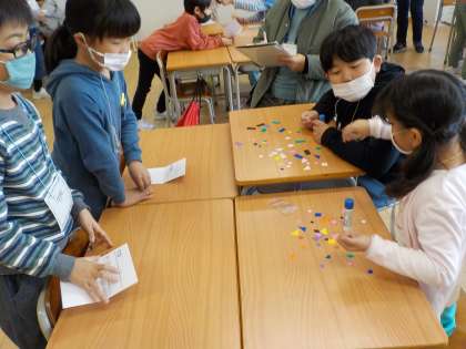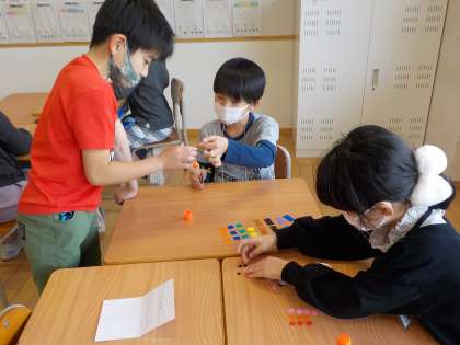 欲しい物(様々な色の形)を尋ねたり答えたりしながらカードを完成させていく活動です。子供たちは、カードのデザインを考えながら、楽しい雰囲気の中で生き生きと英語でやりとりしていました。