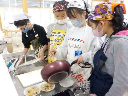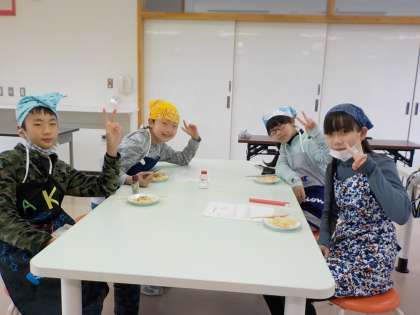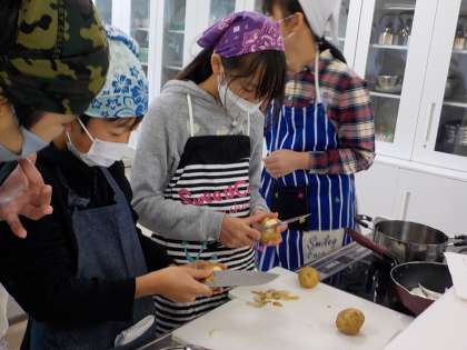 家庭科の実習で、ベーコンポテトを作りました。じゃがいもの皮を包丁でむくことに挑戦しました。家で練習してきたと慣れた手つきで切る子供や、難しそうに切る子供たちなど、様々でした。炒める時は、1学期の実習を生かして、スムーズにできました。