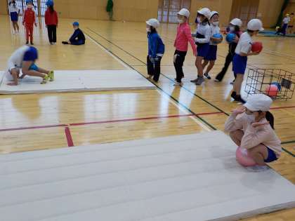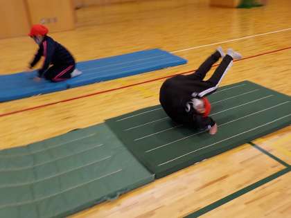体育科の学習でマット運動に取り組んでいます。ボールを足に挟む前転がりや坂を使った後ろ転がりなど、くふうした回り方でこつをつかんでいます。
