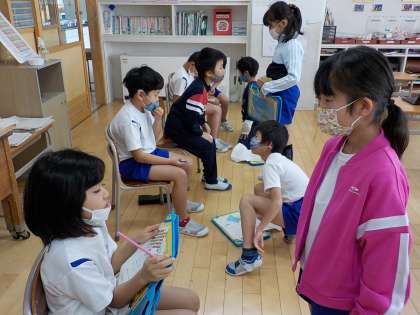 「九九名人」になった子供たちが、今度は判定役となって、友達の九九の暗唱を聞いています。「早く九九名人になりたい!」という思いで、休み時間もがんばっています。