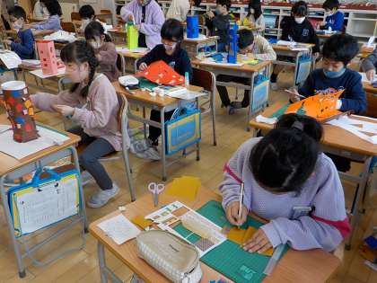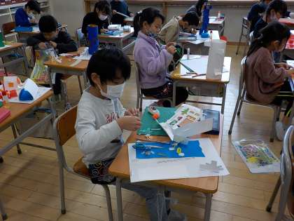 図画工作科の学習で、初めてのカッターに挑戦しています。初めは少し怖がっていた子供たちでしたが、しっかりと使い方の約束を守り、真剣な雰囲気で製作する様子が大変立派でした。正しい使い方をすれば便利な道具。これからも安全に気を付けて学習していきましょう。